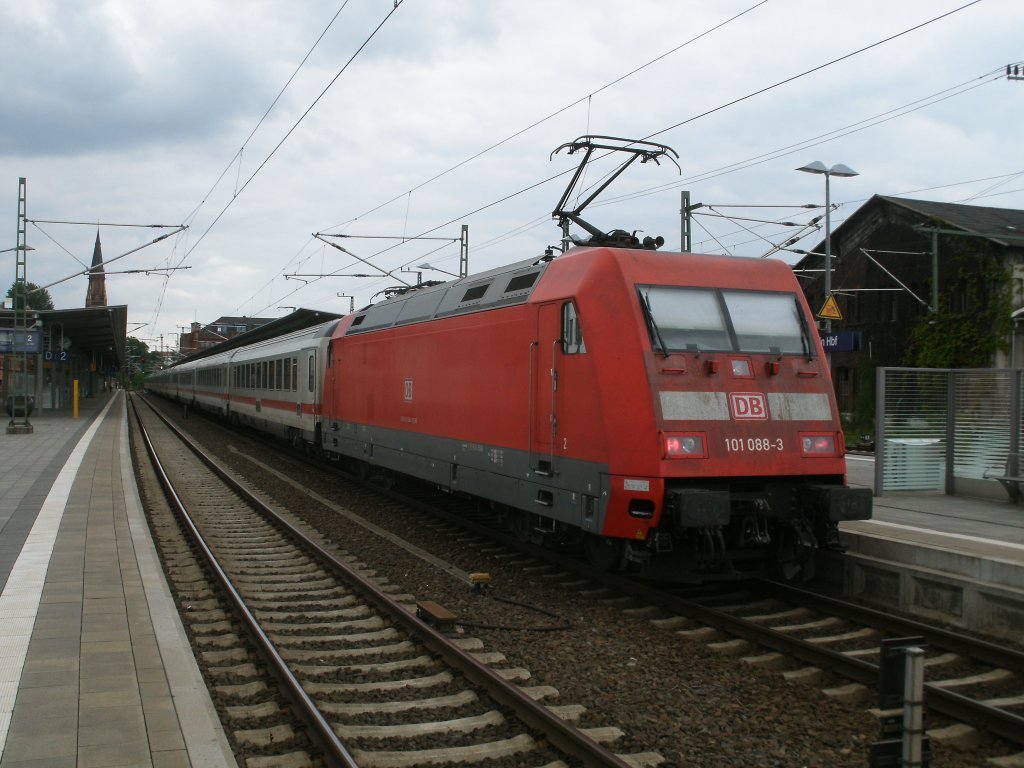 101 088 schob,am 28.Mai 2011,den IC 2213,Binz-Stuttgart,im Abschnitt Rostock-Hamburg über Schwerin.Hier hielt der Zug in der Landeshauptstadt von Mecklenburg-Vorpommern.