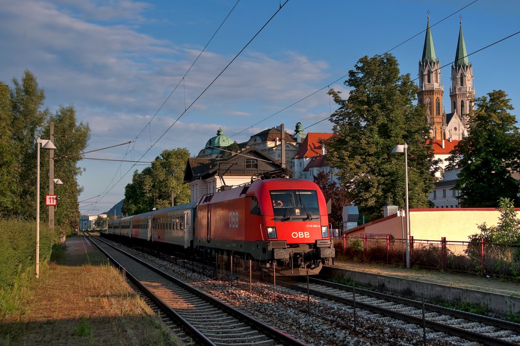 1116 053 mit REX 2118 (Wien FJB - Ceske Velenice) im Bahnhof Klosterneuburg-Kierling. Die Aufnahme enstand am 22.07.2011.