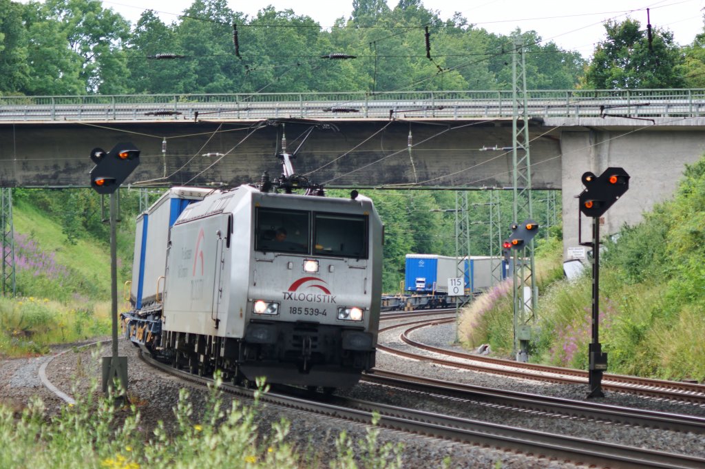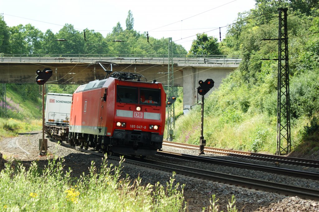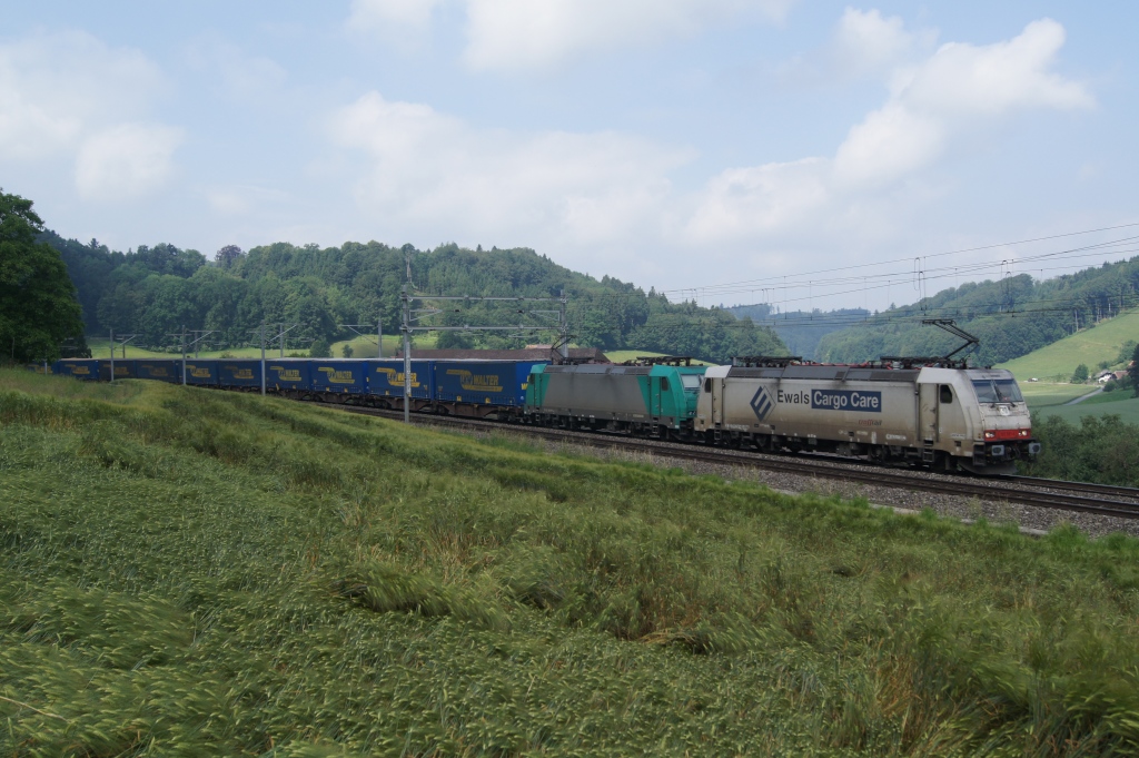 185 581-6 und 185 577-4 ziehen am 4.6.11 einen Containerzug von Burgdorf Richtung Wynigen.