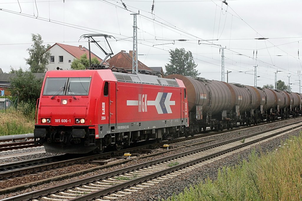 185 606-1 der HGK fährt bei Regen am 22. Juli 2011 mit einem Güterzug Kesselwagen die laut UN Nummer alle mit Benzol beladen waren (1114) in Richtung Bahnhof Berlin Schönefeld Flughafen