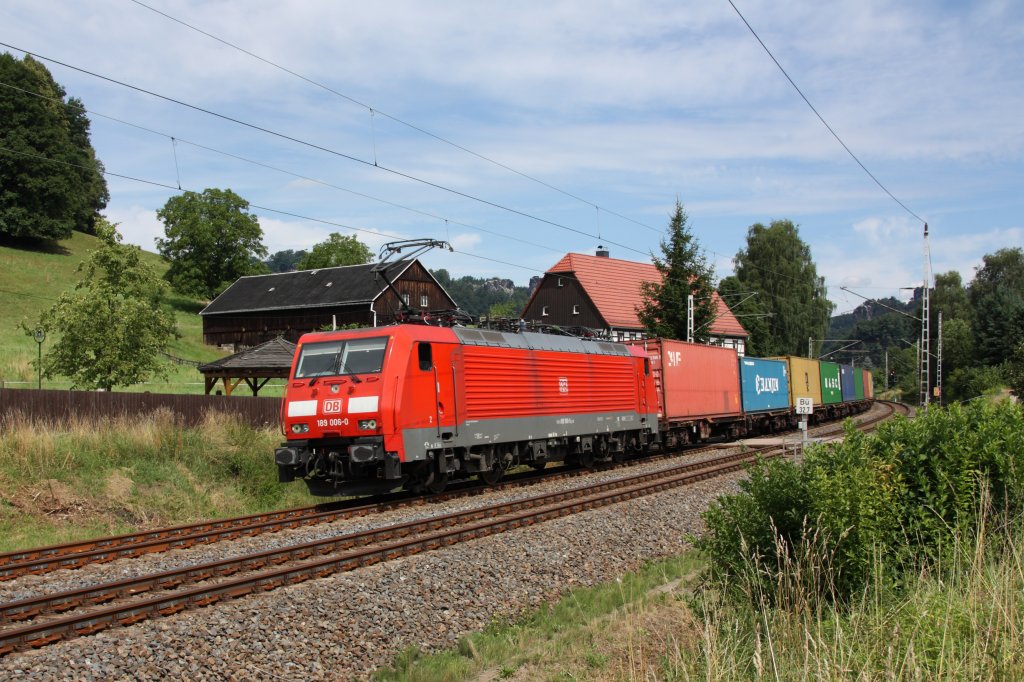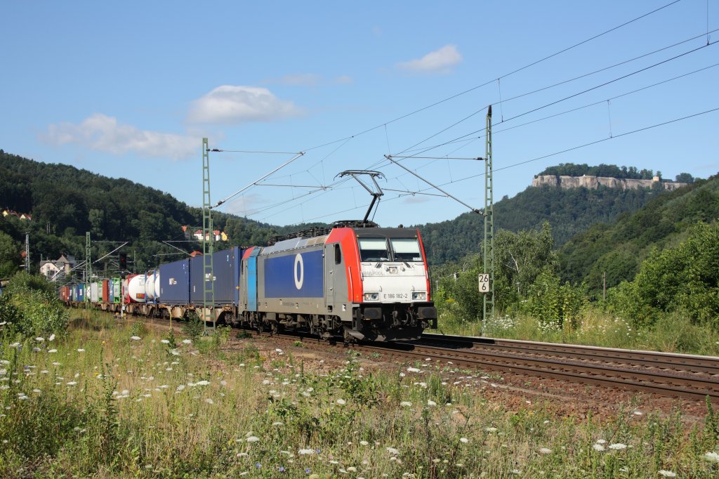 186 182-2 (Railpool) durchfährt am 15.07.2011 mit einem Containerzug die Stadt Königstein im Elbtal. Die Lok ist momentan an RailTransport s.r.o. (CZ) vermietet.
