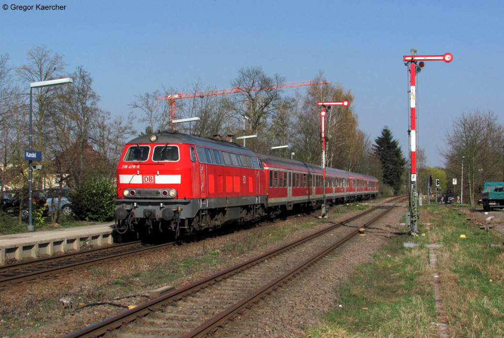 Bereits Geschichte sind die Einsätze der BR 218 in der Südpfalz. Hier die 218 478-6 mit dem RE 28026 (Karlsruhe-Neustadt) bei der Einfahrt in Kandel. Aufgenommen am 29.03.2011.