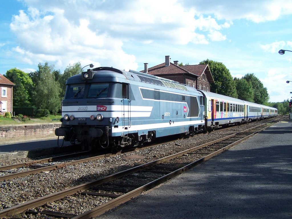 Die BB 567572 steht am 11/07/11 mit dem Zug Strassburg - Saargemünd im Bahnhof Kalhausen.