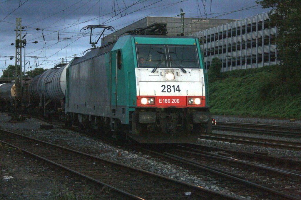 Die Cobra 2814 kommt mit einem Kesselzug aus Antwerpen und fährt in Aachen-West ein bei Dunklen Himmel.