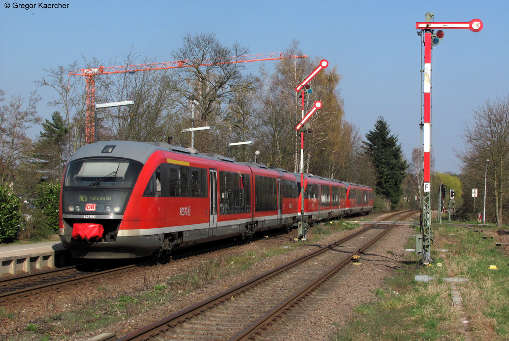 Diese Baureihe hat ab Mitte Juni 2011 auch die Leistungen der BR 218 übernommen: Der VT 642. In Spitzenzeiten kommen hier Langzüge (3 Triebwagen) zum Einsatz um den Fahrgastansturm bewältigen zu können. Am 29.03.2011 verlässt so ein Trio aus 3x VT 642 als RE 28035 (Neustadt-Karlsruhe) den Bahnhof Kandel.