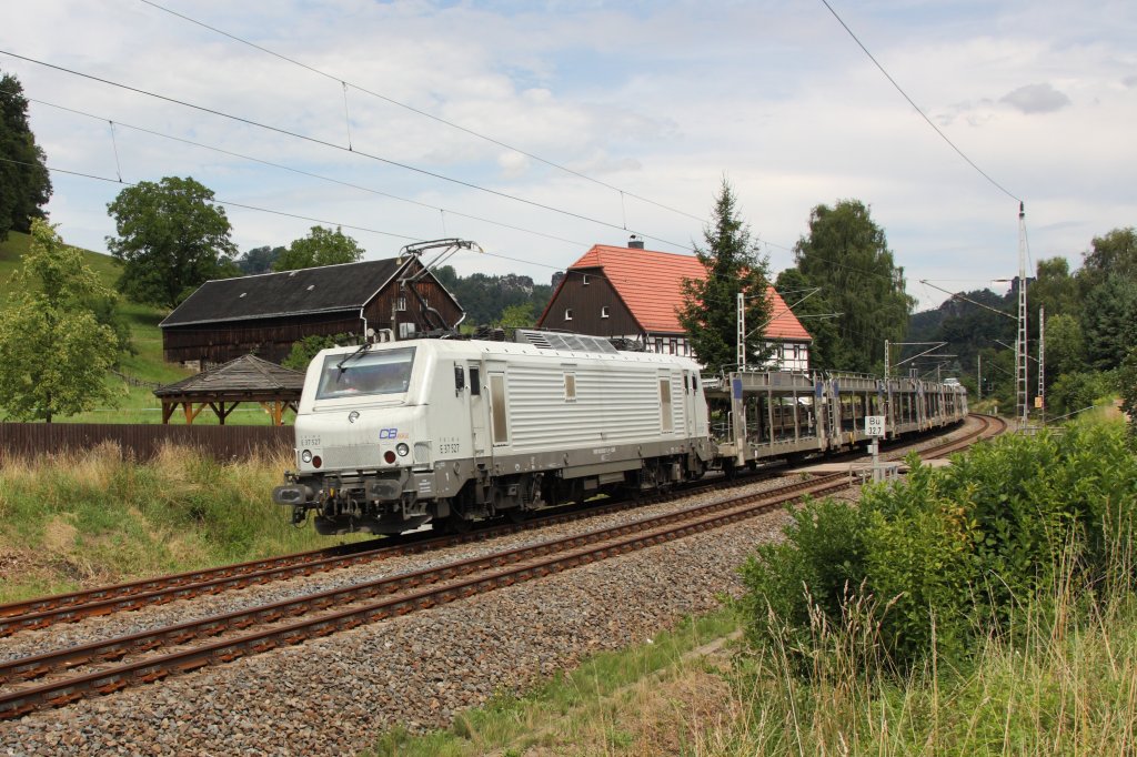 E37 527 der CB Rail ist mit einem leeren Autozug auf dem Weg in Richtung Bad Schandau. Fotografiert am 19.07.2011 am Bü Strand.