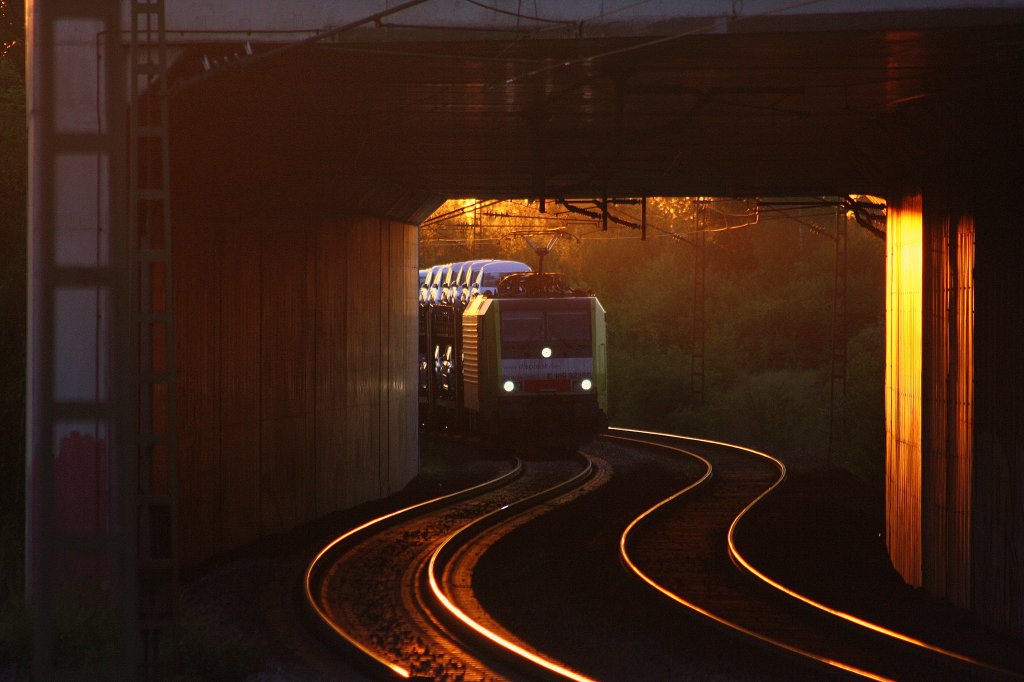 Ein Foto mal aus einer anderen Perspektive: In München Trudering machte sich 189 923 mit ihrem Autozug am Abend des 09.05.2011 auf den Weg Richtung Brenner. Fotostandort ist der nahegelegene Feldweg neben der Strecke.