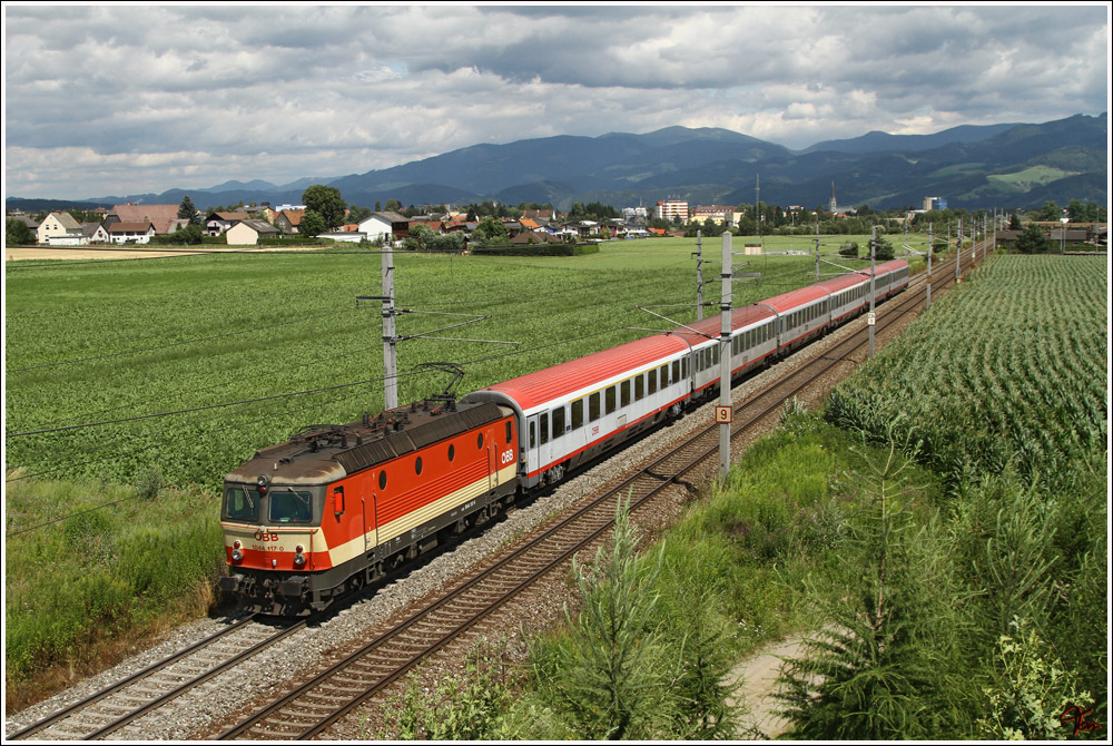 Eine der letzten Maschinen im Schachbrettdesign ist die 1044 117, welche am 21.7.2011 den IC 733 "Sonnenstadt Lienz" von Wien Meidling nach Villach zog.