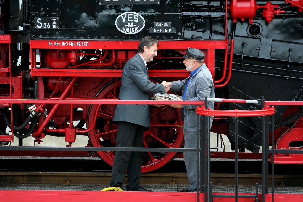 Es ist soweit! Die Lokpapiere von 03 1010 werden nach abgeschlossener Hauptuntersuchung an Stammlokführer Harry Heydenbluth (rechts im Bild) offiziell übergeben. (aufgenommen am 02.07.2011 im Rahmen der offiziellen Übergabe von 03 1010 im Dampflokwerk Meiningen. Das Dampflokwerk war an diesem Tag für Besucher geöffnet!)