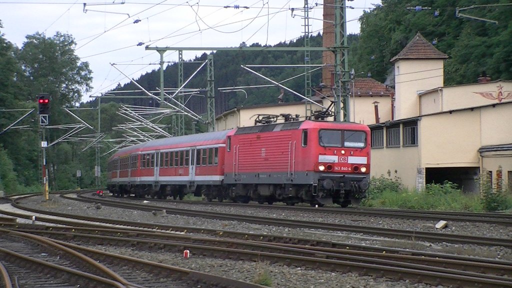 Hier seht ihr eine BR 143 mit 3 n-Wagen bei einer Rangierfahrt in Kronach von Gleis 5 auf Gleis 4. Die Aufnahme entstand am 22.07.2011.