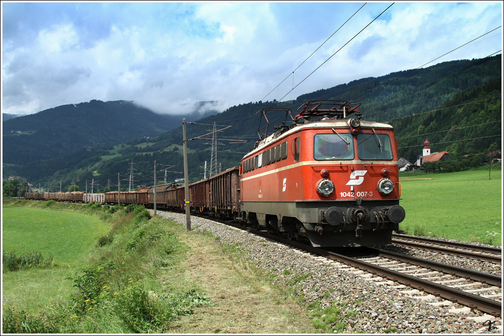 Im aktiven Dienst bei der ÖBB sind zur Zeit nur noch drei Loks der Baureihe 1042.Umso mehr hat es mich gefreut, das ich am 19. 7. 2011 die 1042 007 mit der "Kistn" 54054 von Villach Gvbf nach Wien Zvbf ablichten konnte.