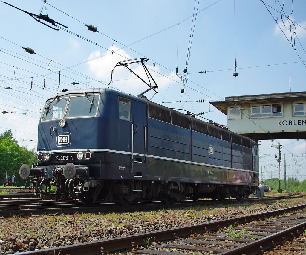 181 206-4. "Speziell für den grenzüberschreitenden Verkehr nach Frankreich und Luxemburg wurden durch die deutsche Bundesbahn ab 1966 bei Krupp bzw. AEG Zweisystem-Loks beschafft. Als sich der grenzüberschreitende Verkehr verstärkte, bestellte die Deutsche Bundesbahn eine weitere Serie. Wegen der vielen eingeflossenen Verbesserungen, wurde sie als Baureihe 181.2 bezeichnet und bestand aus 25 Loks. Die hier gezeigte 181 206 gehört zu dieser Baureihe. Sie konnte mit ihren 4350 PS eine Geschwindigkeit von 160 km/h erreichen. Den Unterschied zur ersten Serie der 181 markieren die hochgezogenen Dachlüfter. Wie die E103 hat die 181 ein aus Segmenten zusammengesetzten Lokkasten, so dass man an den Innenraum herankommen kann indem man die Segmente abhebt."