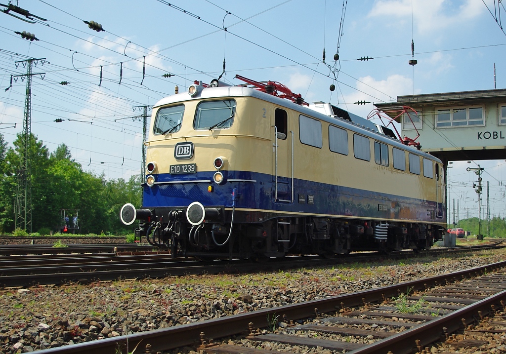 E10 1239. "Die E10 1239 hat eine besondere Geschichte: weil die für den Rheingold bestimmten Lokomotiven der Baureihe 10.12 noch nicht ausgeliefert waren, griff die Deutsche Bundesbahn ersatzweise auf Lokomotiven der Baureihe 10.1 zurück, rüstete sie mit Schnellfahr-Drehgestellen aus und versetzte sie in die blau-beige Farbgebung des Rheingold. Im September 1962 wurde sie wieder in eine E10.1 zurückverwandelt, kobaltblau gestrichen und musste auch ihre Schnellfahr-Drehgestelle an die neuen E10 1265 -1270 abgeben. Sie war in ihren 48 Dienstjahren in Nürnberg und Stuttgart beheimatet."
