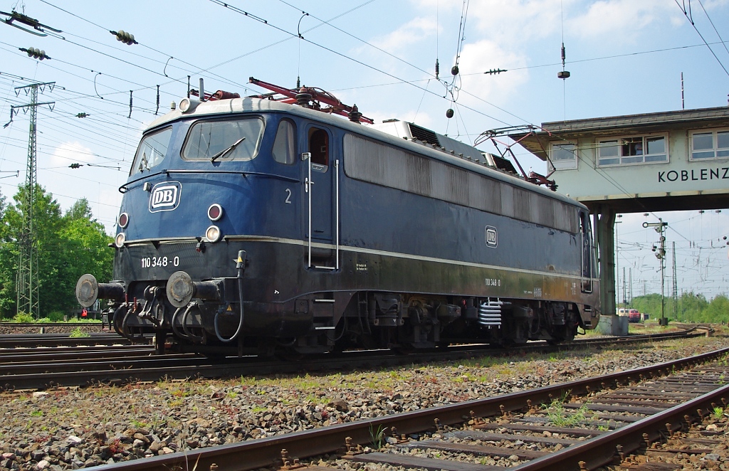 110 348-0. "Die 110 348 hat die klassische Bügelfalte. Der windschnittige Lokomotivkasten wurde ursprünglich für die Loks konstruiert, die den Rheingold und Rheinpfeil ziehen sollten. Ab der 110 288 wurde die Bügelfalte wegen des geringeren Luftwiderstands aber für alle folgenden Serienloks beibehalten. Die E10 348 hat eine Leistung von 5030 PS und eine Höchstgeschwindigkeit von 150 km/h. Kennzeichen dieser Lok war auch das durchgehende Lüfertband, welches ihr besondere Eleganz verlieh."