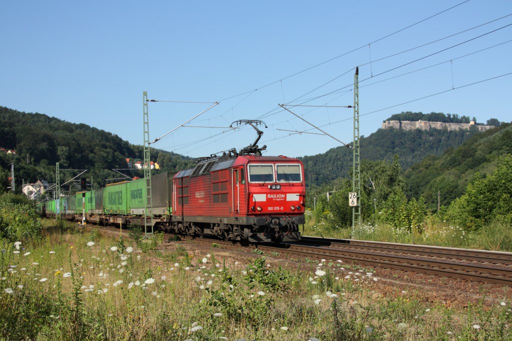 Mit einem Hangartner KLV-Zug ist 180 015-0 gerade auf dem Weg durch das Elbtal in Richtung Decin. Fotografiert am 15.07.2011.