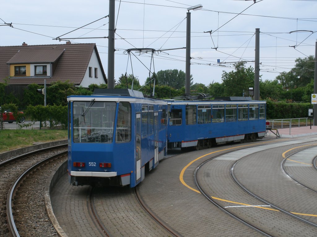 Rostocker Straßenbahntriebwagen 552 im Depot Hamburger Straße aufgenommen von der gleichnamigen Straße am 28.Mai 2011.