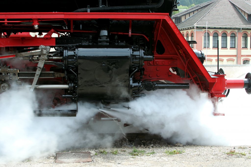 Volldampf voraus! Mit geöffneten Zylinderentwässerungen faucht 03 1010 am 02.07.2011 über das Anschlußgleis des Dampflokwerkes in Richtung Bahnhof Meiningen. (aufgenommen im Rahmen der offiziellen Übergabe nach erfolgter HU im Dampflokwerk Meiningen. Das Dampflokwerk war an diesem Tag für Besucher geöffnet!)
