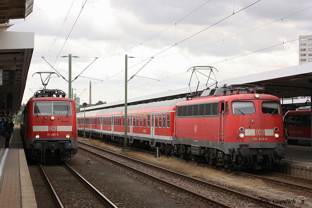 111 091 mit einem RE aus Hannover und 110 449 mit einer RB aus Hildesheim(letzter Einsatztag von 110 449) in Braunschweig HBF am 23.07.2011.