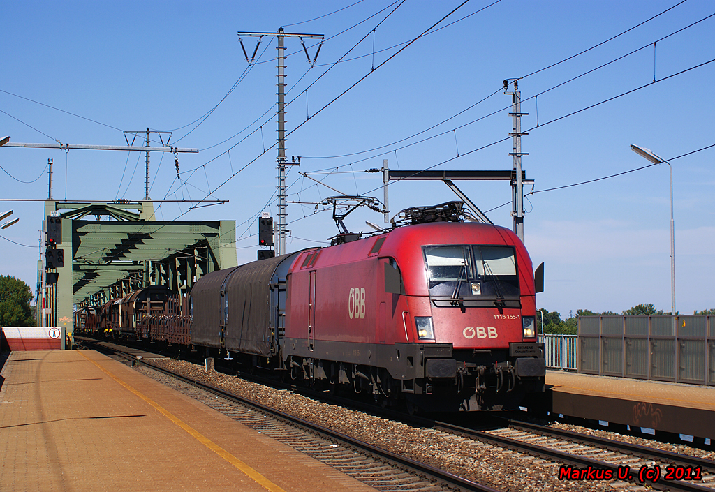 1116 155 hat soeben mit einem gemischten Güterzug die Donau überquert. Wien Praterkai, 28.06.2011