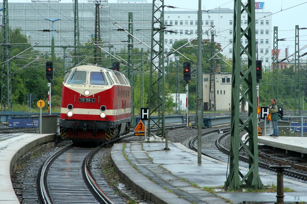 119 158 am 02.07.2011 auf Gleis 4 in Halle/S. Hbf kurz vor Übernahme des Historischen Schnellzuges und des Traditionszuges vom Traditionszug Berlin e.V., die von hier aus als Zugverband nach Berlin rollten (leider bei strömendem Regen!)
