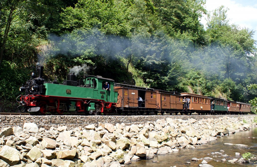 16.07.2011, 99 586 im Spechtritzgrund - der Traditionszug aus Radebeul mit der 1913 gebauten IV K (Betriebsnummer 176) war zum Kleinbahnfest auf der Weißeritztalbahn unterwegs