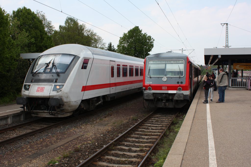 628 705 und ein IC-Zug stehen im Bahnhof Crailsheim. In kürze wird der 628 nach Heilbronn fahren und der IC-Zug strebt auch ein Ziel an, das mir allerdings unbekannt ist. Ds Bild machte ich am 1.5.2011.