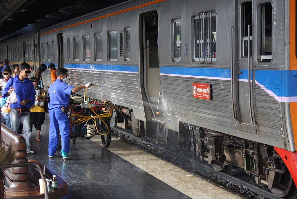 Auch wenn die Reisenden schon beim Einsteigen sind, die Außenreinigung muß sein. NKF 1252 als erstes Fahrzeug des SP EXP 75 nach Udon Thani am 19.März 2011 im Bf. Hua Lamphong auf Gleis 11.