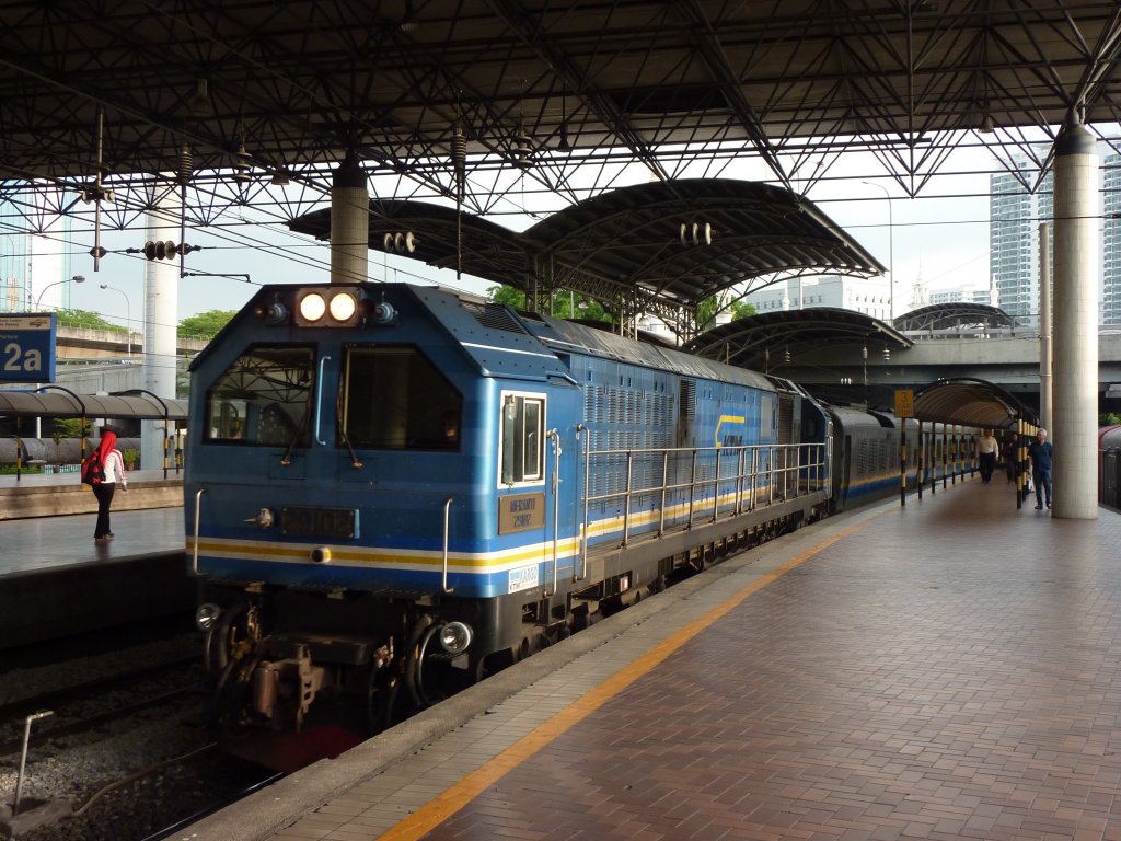 Auf dem Weg von Singapore nach Butterworth passiert der Ekspres Rakyat den alten Bahnhof von Kuala Lumpur am 18.4.2011. Eine Besonderheit vieler Malaysischer Züge sind die Generatorwagen, der hier direkt hinter der Lok eingereiht ist.