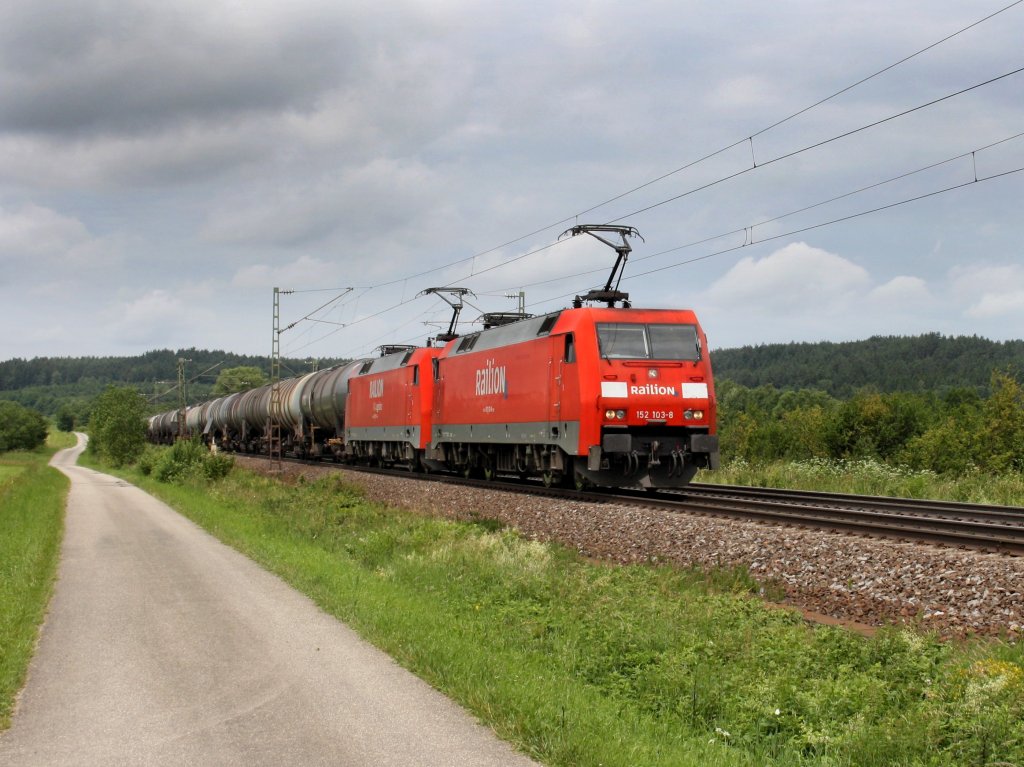 Die 152 103 und die 152 127 am 21.06.2011 mit einem Kesselwagenzug unterwegs bei Pölling.