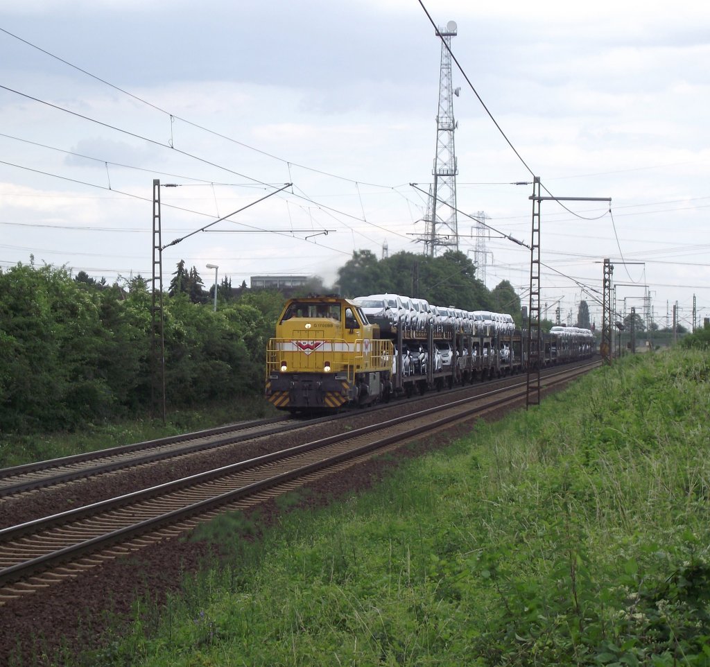 Eine MaK G 1700 BB von Wiebe ist am 9. Juli 2011 mit einem Autotransportzug bei Ahlten Richtung Hannover unterwegs.