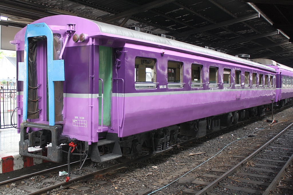 Im neuem Design steht der บกข.1038 (บกข. =BRC./Bogie Buffet Carriage, Bogie Restaurant Car) am 19.März 2011 im Bf. Hua Lamphong auf Gleis 12.