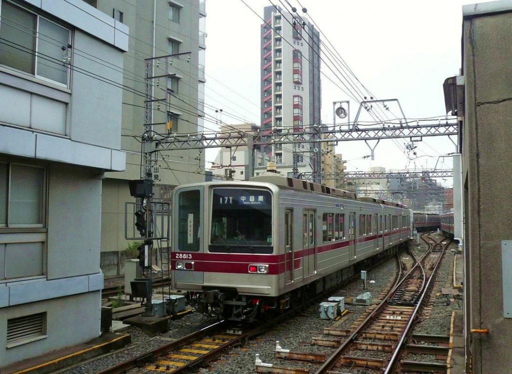 Tôbu-Konzern Serie 2xxxx / Tokyo Metro Hibiya-Linie: Auf mehreren Linien der Tokyo Metro U-Bahn werden planmässig einzelne Kurse mit Wagen des Tôbu-Konzerns gefahren. Im Bild die Serie 2xxxx, die von den Tôbu-Strecken im Norden von Tokyo herkommend die gesamte Hibiya-Linie der Tokyo Metro U-Bahn befährt bis Naka Meguro am westlichen Rand der Tokyo-Innenstadt. Im Bild der nordseitige achte Wagen (28813) des Zuges 21813 an der Endstation Naka Meguro bei der Einfahrt ins Abstellgleis. 4.Juli 2010.