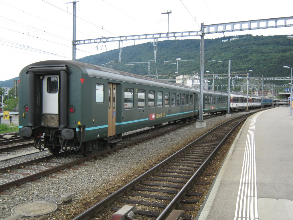 Verstärkungswagen am IR 2286 in Locarno, 23.07.2011. Die vorderen 4 Wagen, 3 B EWII und ein A EWI, wären fahrplanmässig ein 1 A EWIV und 3 Bpm 51, an diesem Tag wurden sie zur Freude des Fotografen ersetzt. Die anderen 2 B EWII sind zur Verstärkung angehängt. So waren es gesamthaft 6 EWI/II Wagen.