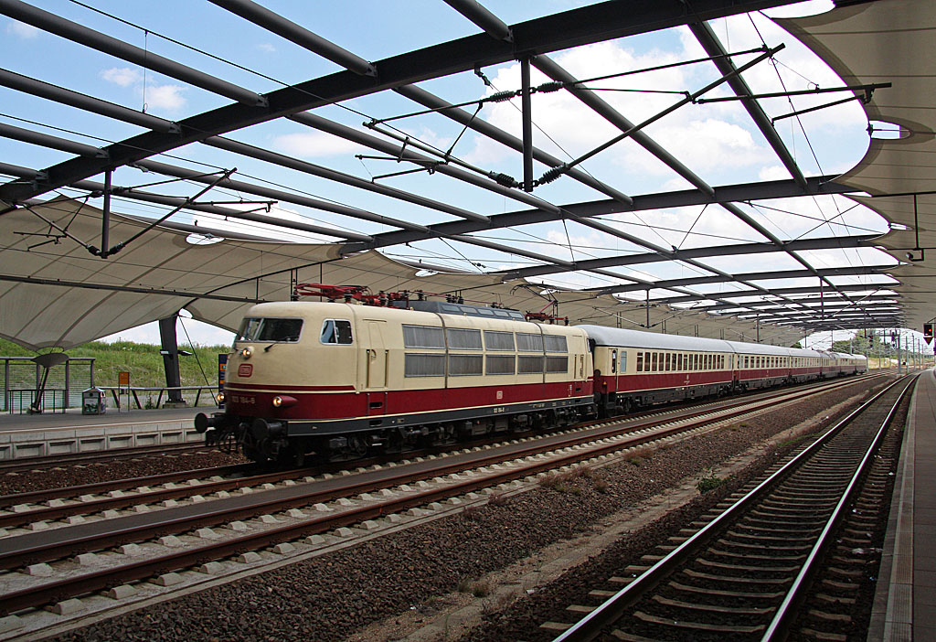 Vom 6.-10.07.2011 führte ein Sonderzug der AKE Eisenbahntouristik den, von 103 184-8 gezogenen, TEE-Rheingold zu mehreren Reisezielen in Sachsen. Hier durchfährt er auf der Rückfahrt am 10.Juli den Bahnhof Leipzig-Flughafen.