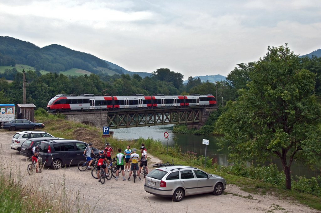 Während R 3626 von Kleinreifling nach Linz unterwegs ist, machen sich andere soeben zu einer Radtour im Ennstal bereit. Trattenbach, am 13.07.2011.