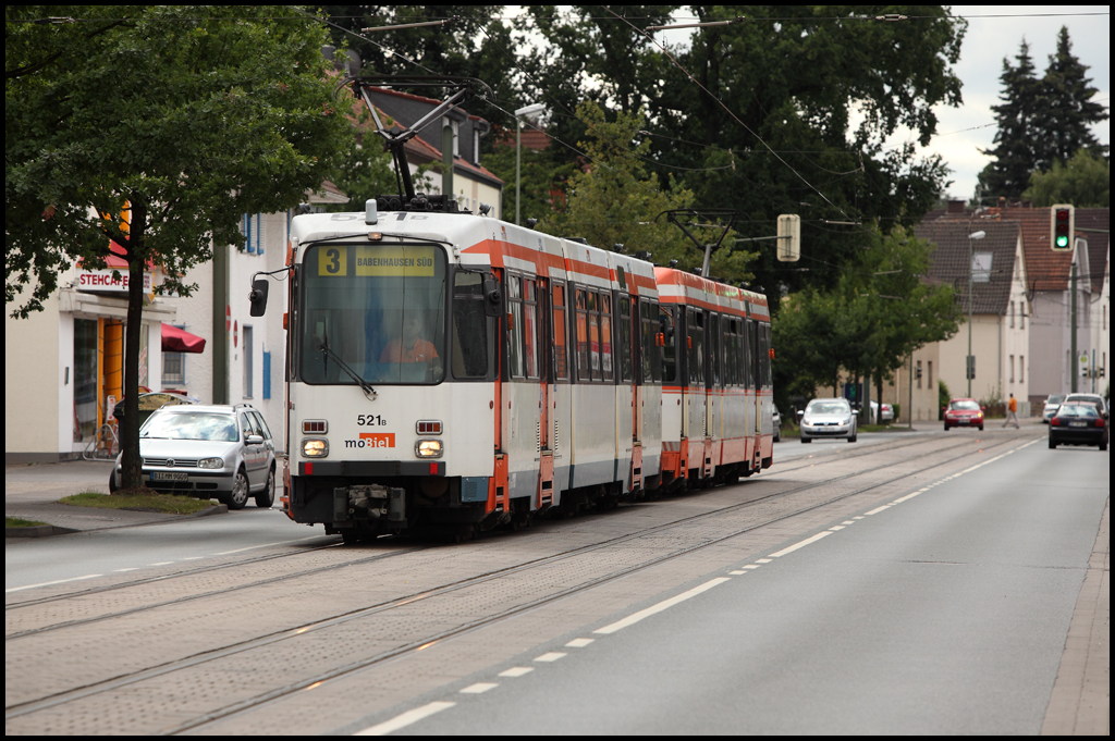 Zwei Stadtbahnwagen vom Typ M8C sind nachnach Babenhausen-Süd unterweges. (Stadtverkehr Bielefeld am 18.07.2011