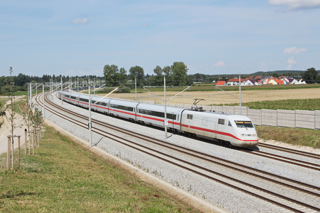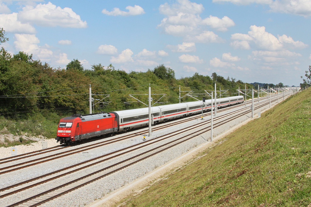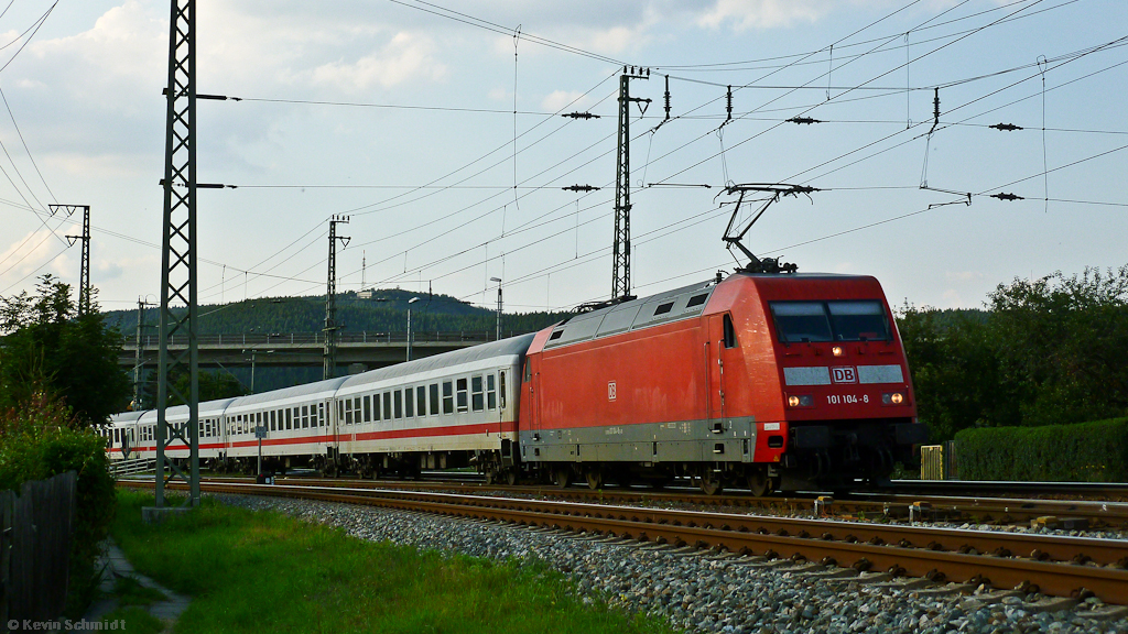 ICE 109 nach Innsbruck hat soeben den Kronacher Bahnhof verlassen und passiert gerade auf seiner Fahrt durch das Stadtgebiet von Kronach die Anschlussgleise des Mineralölwerkes. Aufgenommen am 28. Juli 2011.
