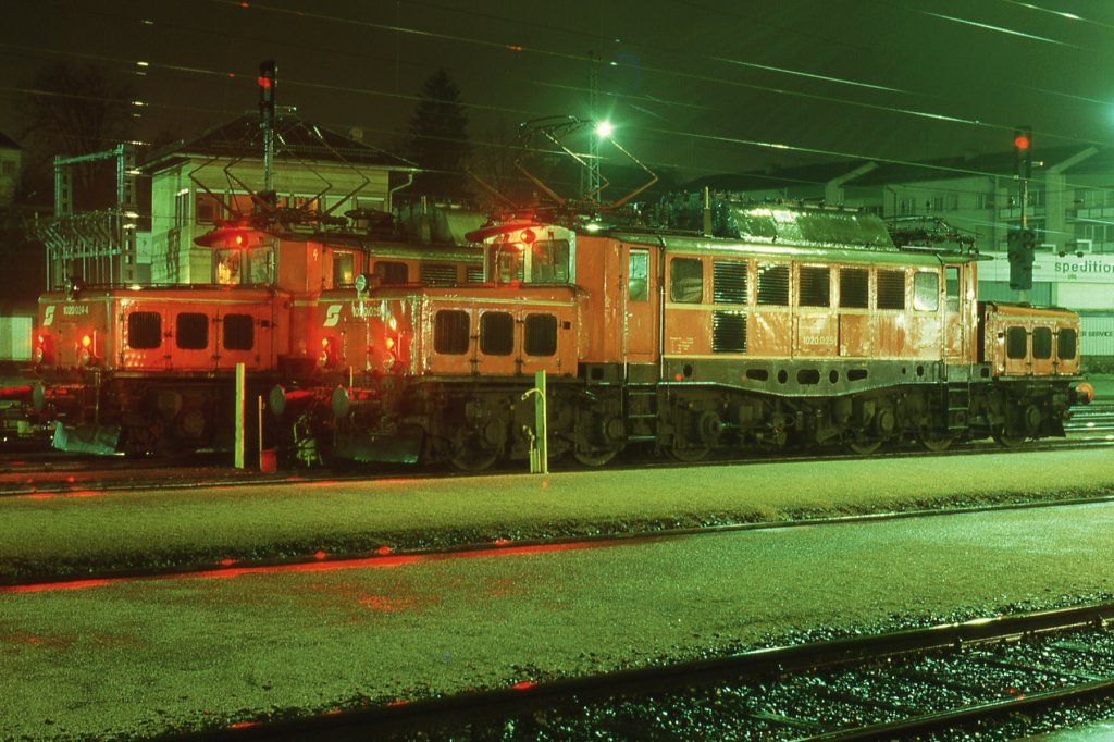 1020 024 und 1020 025 in einer verregneten Sommernacht 1986 in Villach.