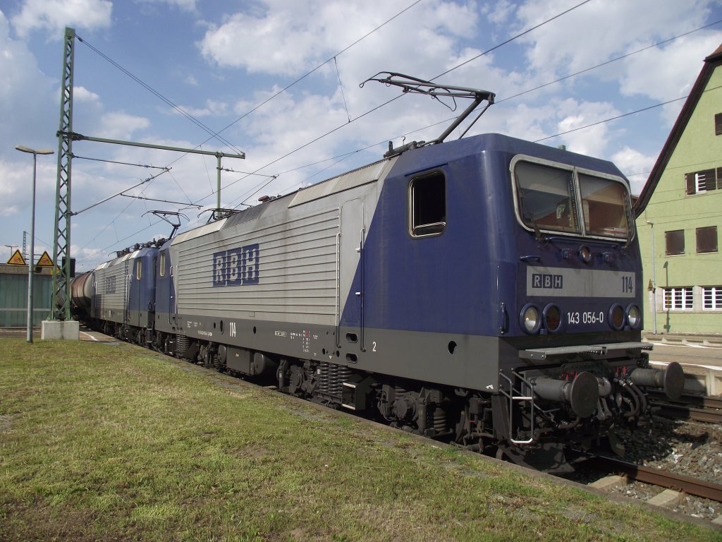 143 056-0 (RBH 114) und 143 571-8 (RBH 119) stehen am 28. Juli 2011 mit einem leerem Kesselwagenzug auf Gleis 4 in Kronach.