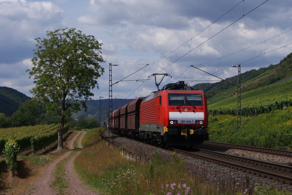 189 036-7 mit einem Erzzug in Pommern an der Mosel am 25.07.2011