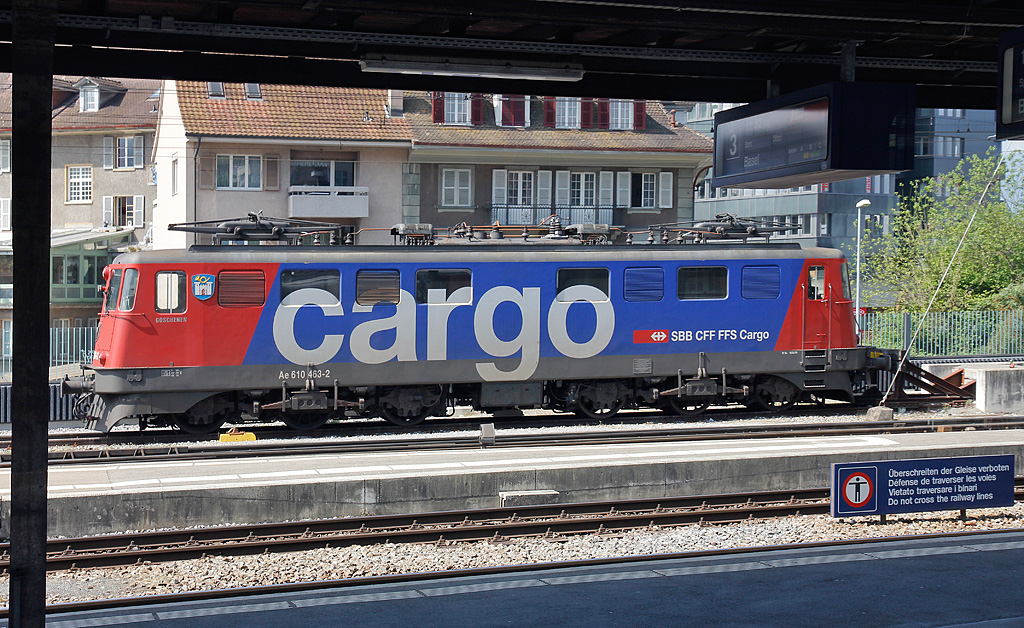 Ae 6/6 mit Wappen "Göschenen", Nr. 610 463-2, abgestellt im Bahnhof Thun. Aufnahme während Zwischenhalt durch die Fensterscheibe hindurch, 30. April 2011, 10:25.