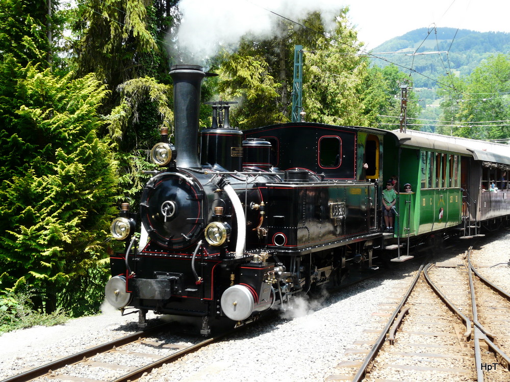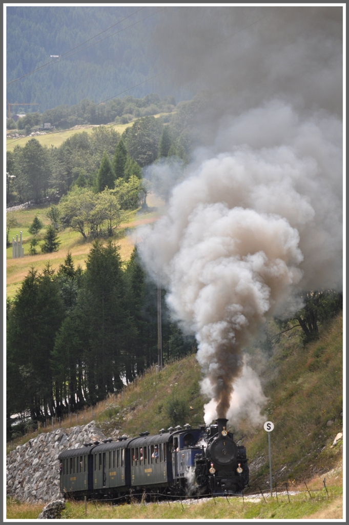 Die kohlenbefeuerte Lok 2 bekommt soeben ihr  Futter . Entsprechend gibts Rauchschwaden, welche die Sicht auf den Dirrengrind (1957 m ü. M.) teilweise verdecken. Im B27 Salon Rouge oberhalb der Chüemad, 16. Juli 2011, 11:35