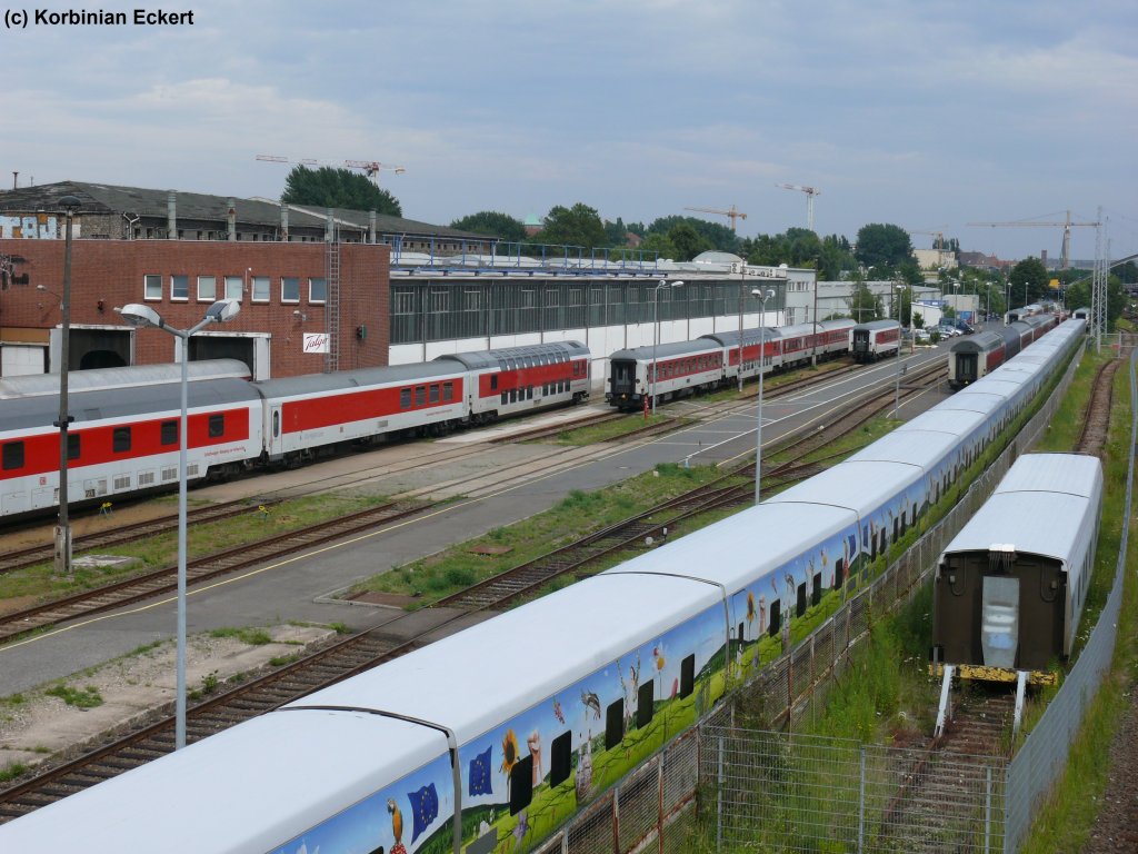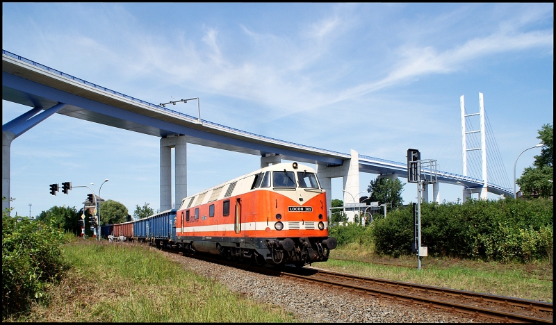 Nachdem LOCON 301 den 2. Teil eines Leerzuges vom Südhafen zurück auf die Hafenbahn gedrückt hat, ist sie am 12.07.2011 nun dabei, die Wagen hinauf zum Rügendammbahnhof zu ziehen. Hier wird der Zug zusammengestellt und für seine Fahrt nach Peitz-Ost vorbereitet. Eine Szene, die sich mehrfach in der Woche mit Zügen von DB Schenker, DP, Ekotrans und LOCON beobachten lässt. Allerdings stellt hier der Einsatz einer V180 schon eine echte Seltenheit dar, zumal zum gleichen Zeitpunkt mit DP 25 sogar noch eine weitere Lok dieser Baureihe im Stralsunder Nordhafen weilte.