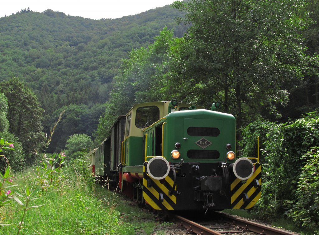 Das Brohltal von seiner allerschönsten Seite: Die O&K Diesellok D1 mit dem "Vulkan-Express" bei St. Tönnis. Brohltalbahn am 28.7.2011.