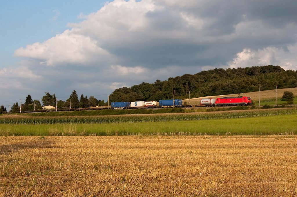 DB BR 185 ist mit diesem Güterzug kurz nach Neulengbach Richtung Westen unterwegs. Die Aufnahme enstand am 27.07.2011 kurz vor 19:00.