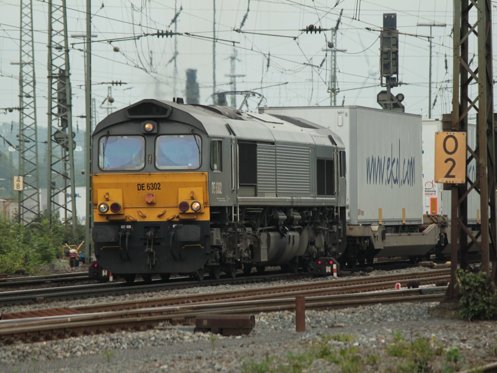 Lok 41 (MaK DE 1002) der Kreisbahn Siegen-Wittgenstein (KSW) fährt am 01.07.2011 in Herdorf mit einem Güterzuges zur Übergabefahrt in Richtung Betzdorf los.