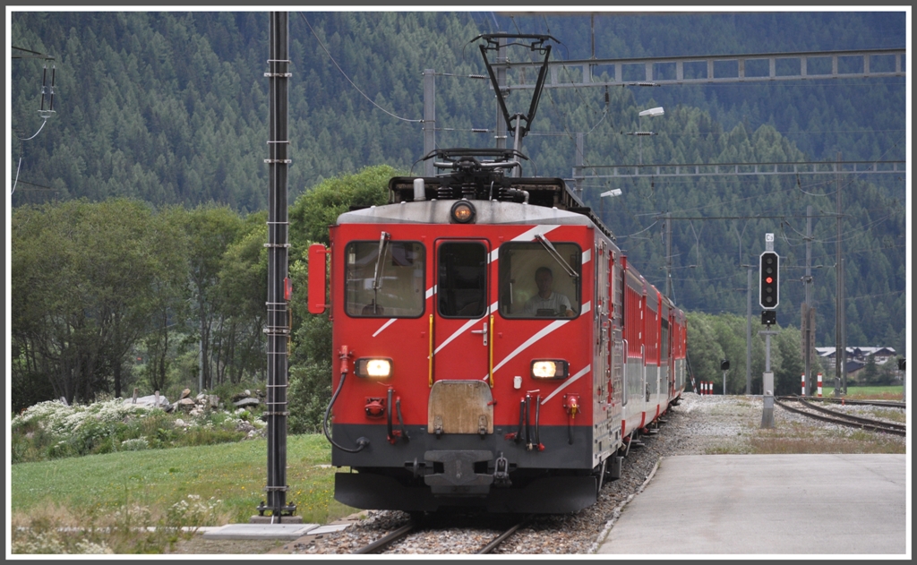 Der Regio 546 aus Brig mit einem Deh 4/4 fährt in Oberwald ein. (21.07.2011)