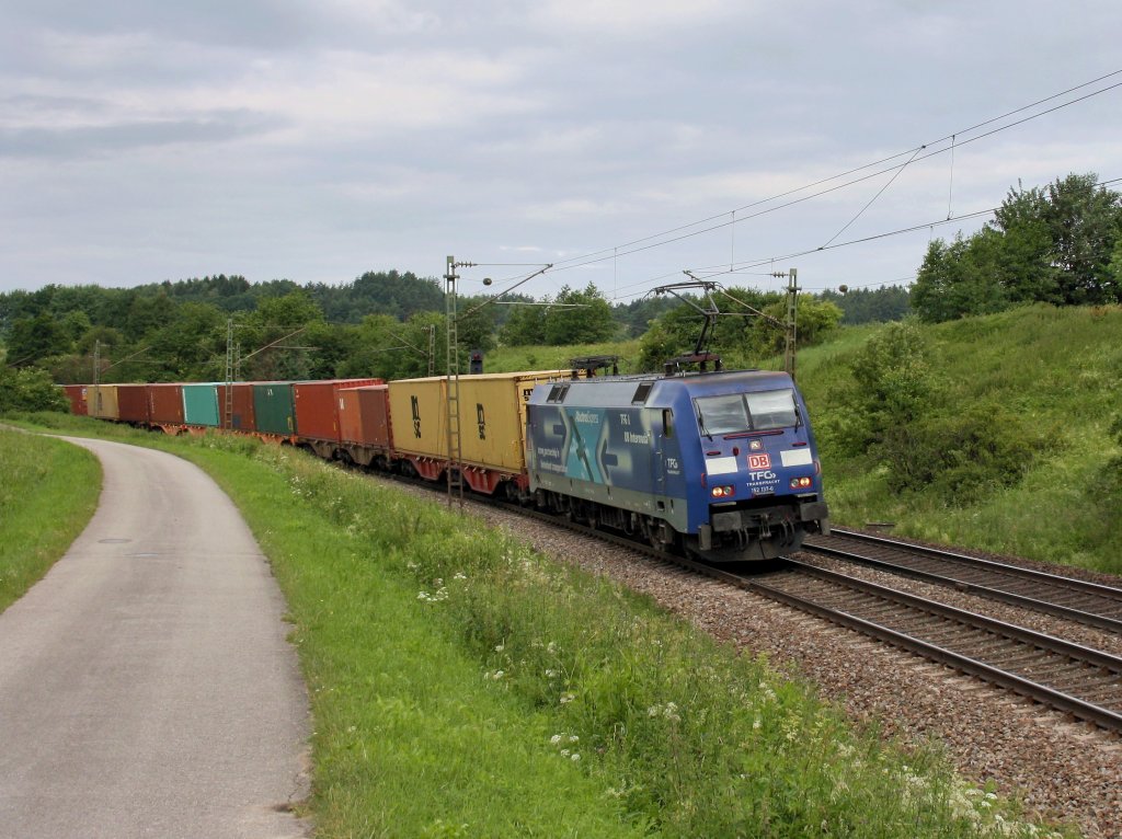 Die 152 137 am 21.06.2011 mit einem Containerzug unterwegs bei Pölling.