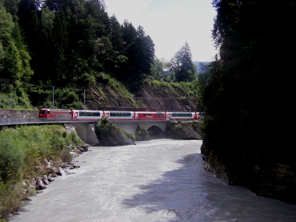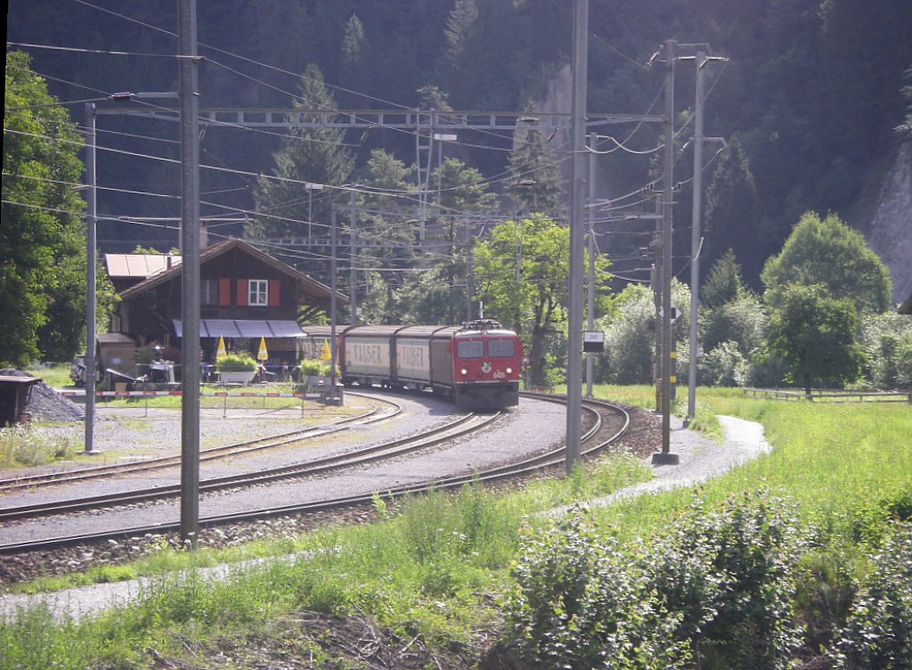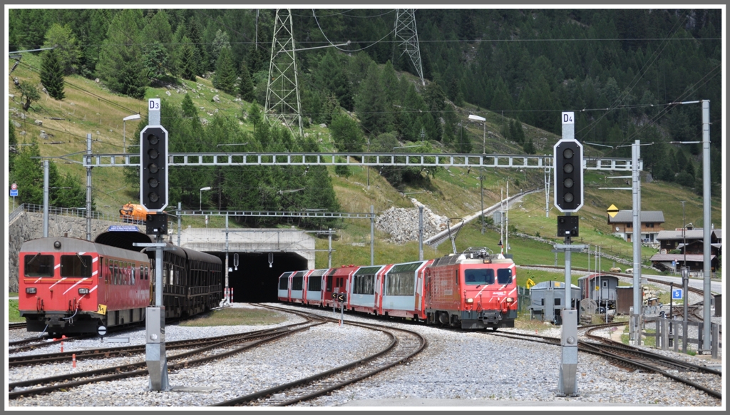 Impressionen aus Oberwald. Glacier Express 905 mit HGe 4/4 II fährt ohne Halt durch den Bahnhof, links ein Steuerwagen des Autozuges durch den Furka Basistunnel nach Realp. Rechts über der Lok ist die Furka Bergstrecke und das Verbindungsgleis zur DFB sichtbar.(21.07.2011)