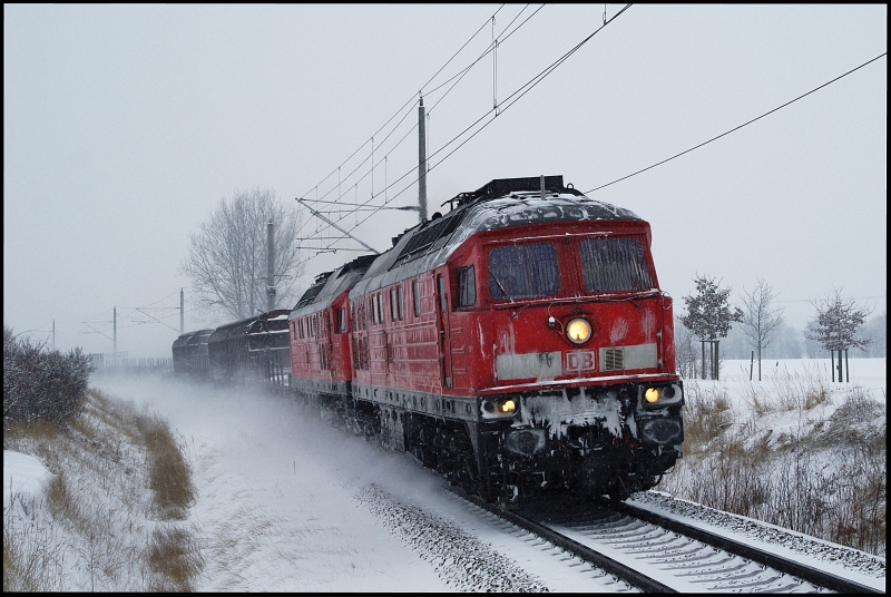 Ein Anruf am 17.12.2010 veranlasste mich, meine Mittagspause ins Freie zu verlegen: „Atombullen am Eberswalder ...“ hieß es. Die Wetter- und Lichtbedingungen waren eher suboptimal, aber egal ... spitz geht immer. ;) Die beiden Damen hatten ja die Tage zuvor schon ordentlich Überstunden beim Castortransport nach Lubmin gesammelt. Trotzdem präsentierten sich 232 209-7 und 232 347-5 in Kummerow putzmunter vor dem 52978 von Rostock-Seehafen nach Eberswalde und das sogar noch unter  Vollschutz . Aufgenommen vom Bahnsteigkopf des Hp Kummerow. Danke Christian. :)